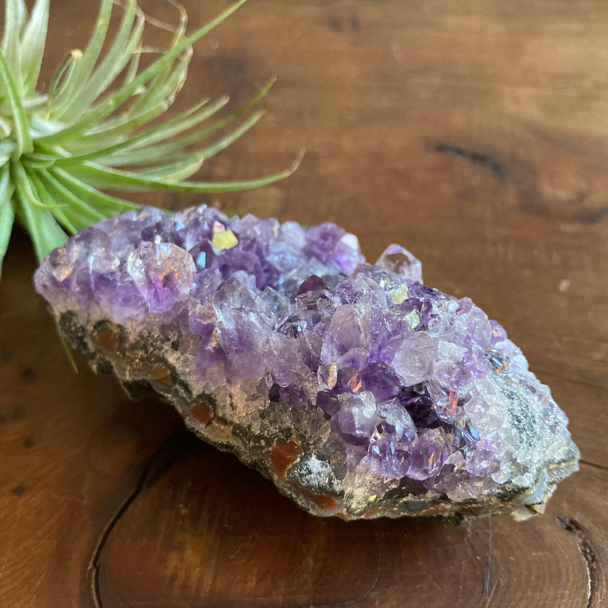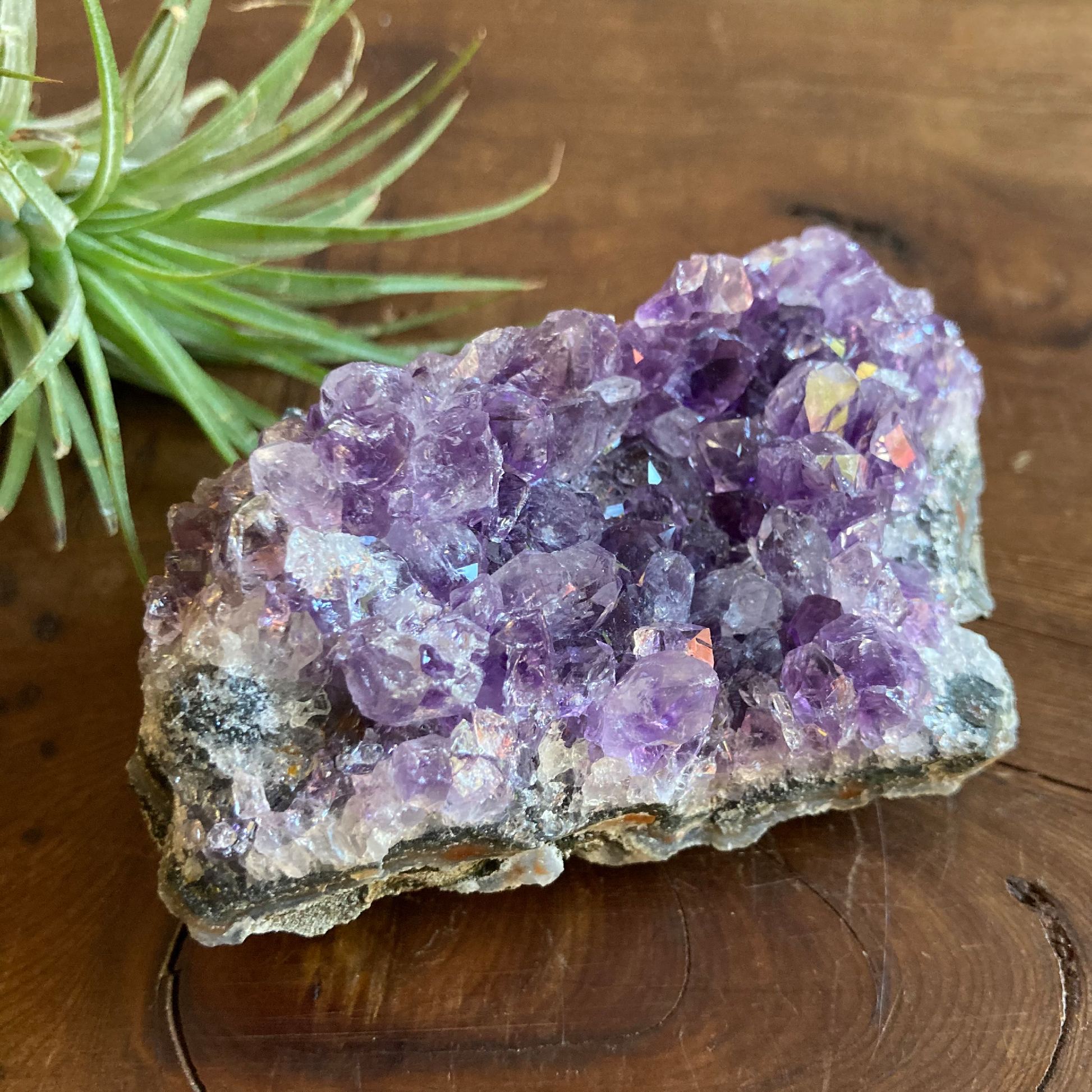 This stunning, sparkling free-form amethyst cluster makes a gorgeous statement piece on a vanity, in a study, guest room, and even the kitchen. Complement it a sweet air plant, a calming candle, or even use it as a healthful jewelry holder.