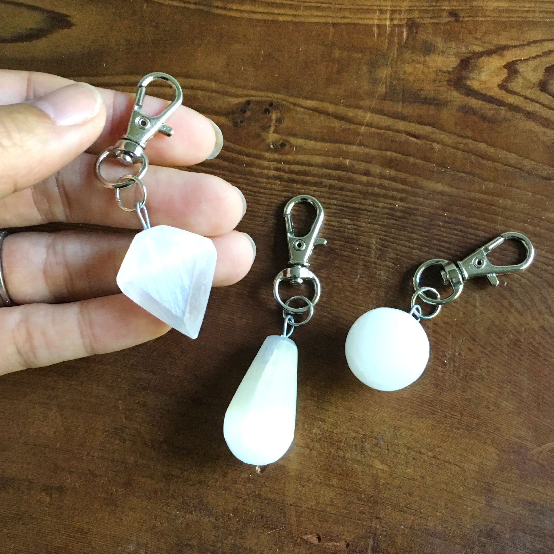 These SELENITE CHARMS come in three different shapes: DIAMOND, TEARDROP, and  SPHERE.
